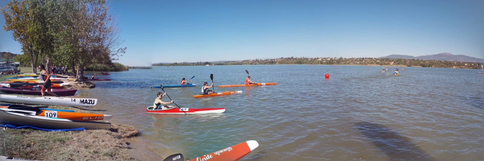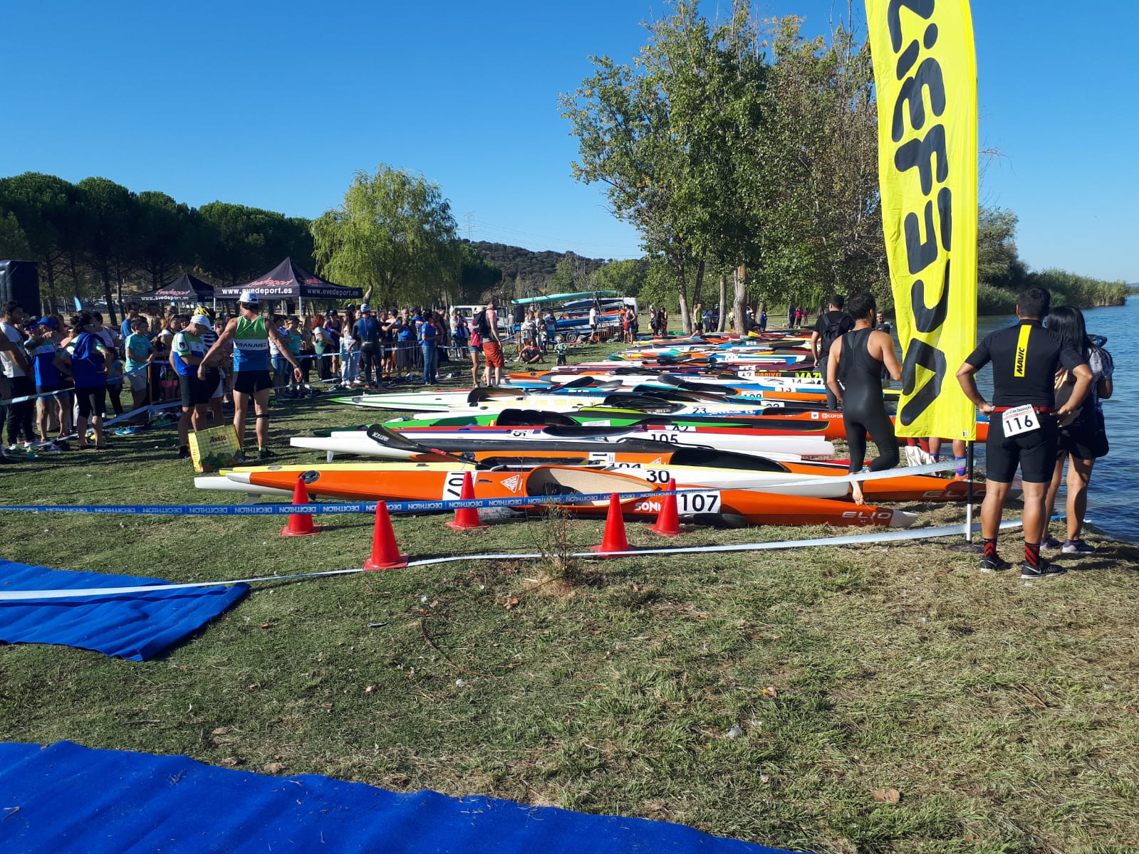 Durante la primera parte de la mañana, todo fue un ir y venir de cuadriatletas, organizadores, voluntarios y familiares preparando los “boxes” para las bicicletas, las piraguas, echando un vistazo al campo de regatas, visualizando la primera (y concurrida) boya de natación… sumándole a todo ello los puntos donde dar el relevo para los equipos.