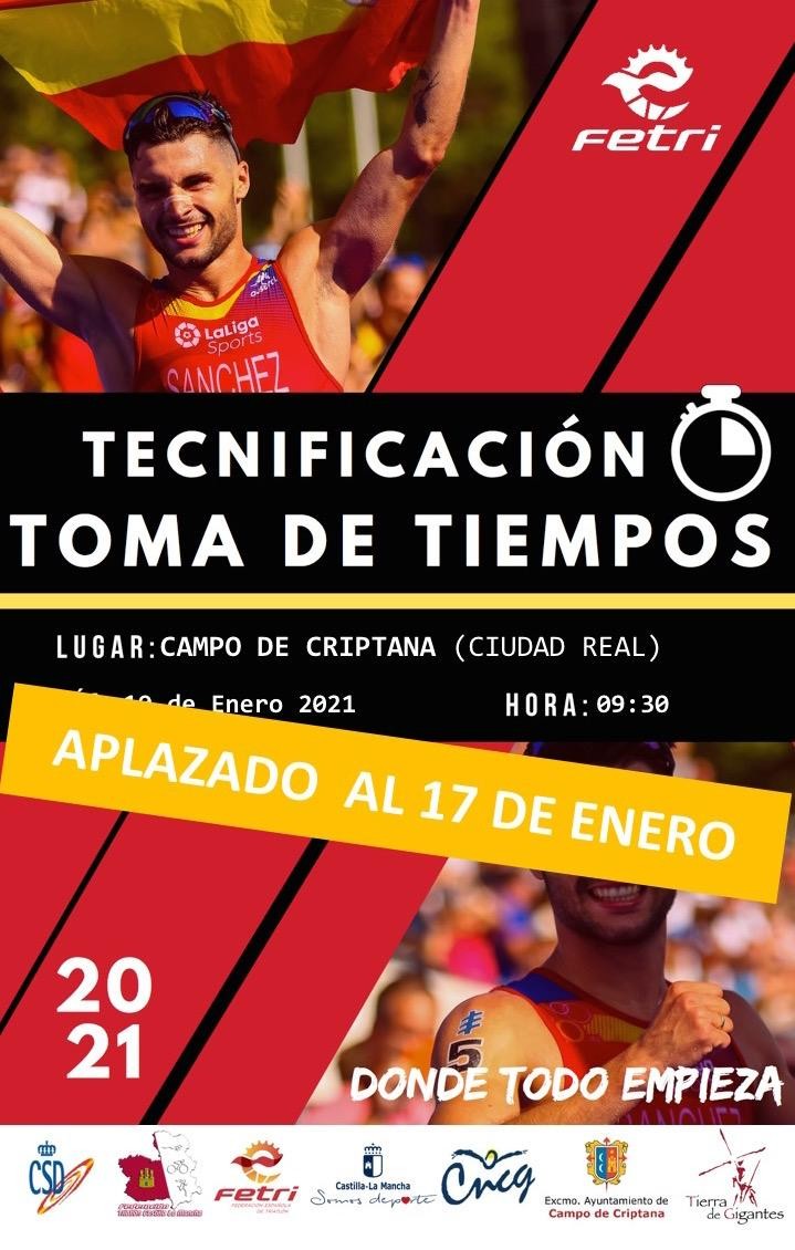 Desde la Federación de Triatlón y debido a las inclemencias meteorológicas de este fin de semana y en previsión de que el tiempo empeore según pasan los días nos vemos obligados a aplazar la toma de tiempos, evitando desplazamientos por carretera y seguramente las pistas de atletismo estén con hielo y nieve a la hora de realizar la prueba de carrera.