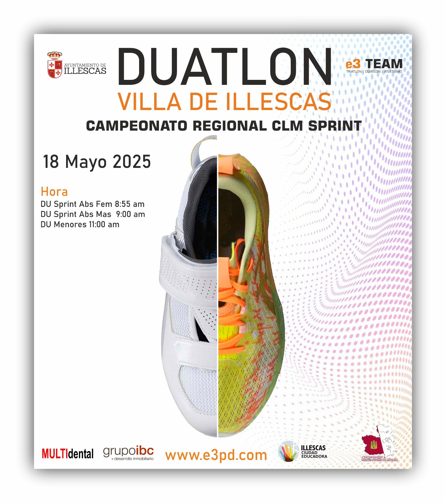 E3 EVENTOS, junto a e3 TEAM, el Excelentísimo Ayuntamiento de Illescas y la Federación de Triatlon de Castilla la Mancha organizan el Domingo 18 de Mayo de 2025 en Illescas la segunda edición del DUATLON VILLA DE ILLESCAS, prueba CAMPEONATO REGIONAL DE DUATLON CATEGORIA SPRINT de Castilla la Mancha.